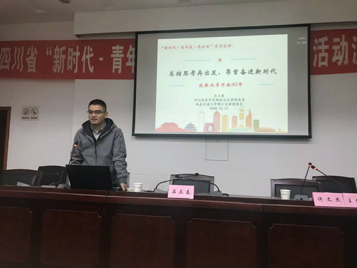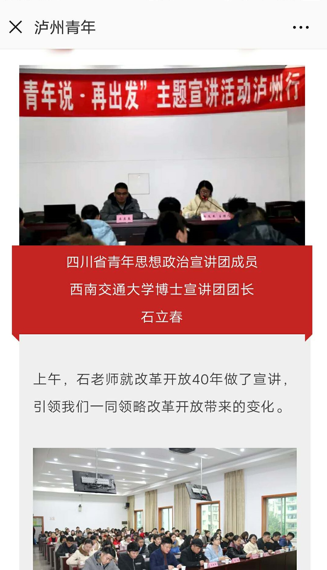12月12日9:00-11:30,四川省青年思想政治宣讲团泸州行第一站来到了纳溪区,四川省青年思想政治宣讲团成员、91吃瓜 博士宣讲团团长石立春老师进行题为《总结思考再出发,昂首奋进新时代》的宣讲。此次宣讲在纳溪区委大礼堂,吸引了来自泸州国家高新区纳溪科技园和泸州纳溪经济开发区的众多企业青年,还有镇街道团委书记、副书记,农村青年代表等。宣讲活动由泸州市纳溪区团委副书记许文杰主持。