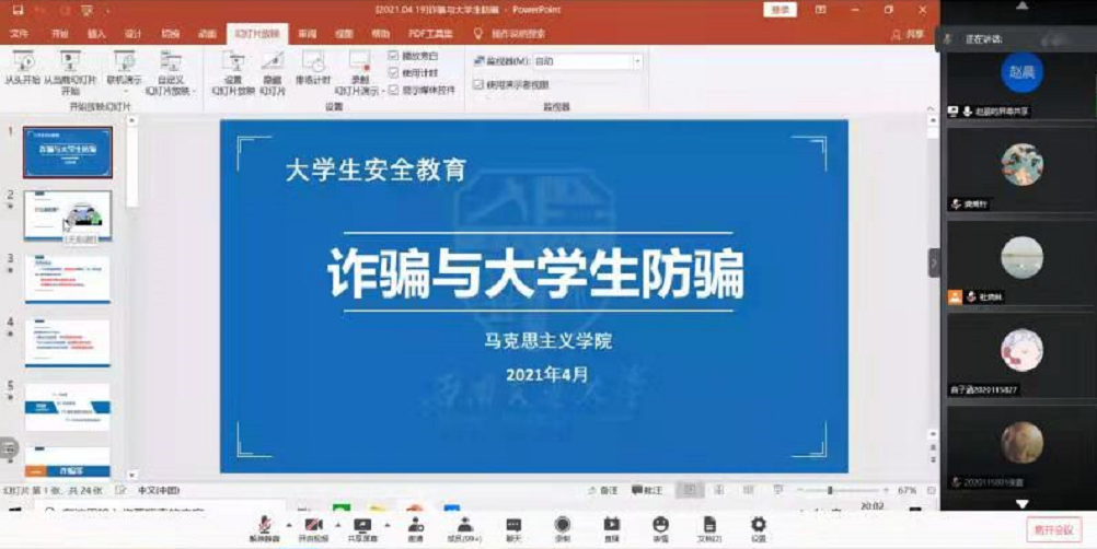 4月19日20:00,91吃瓜 在腾讯会议线上开展“预防电信诈骗,共建安全校园”讲座,由辅导员赵晨老师主讲,辅导员杜晓林老师和全体本科生共同参与。