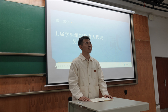随后,上届学生会主席吴昊分享三年来在学生会的工作经验,吴昊表示学习工作要两手抓,在关键时候,学生组织成员要顶上去,发挥模范作用,任务要保质保量保速完成。