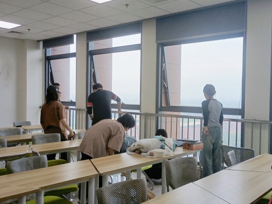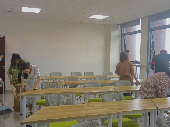 自习室和储物间等公共区域进行了细致打扫。活动过程中,同学们分工明确、相互配合。有的同学负责扫地和清理地面垃圾,有的同学负责拖地,还有一部分同学负责擦窗户、擦桌子等,用实际行动践行了“崇尚劳动,热爱劳动”的劳动精神。