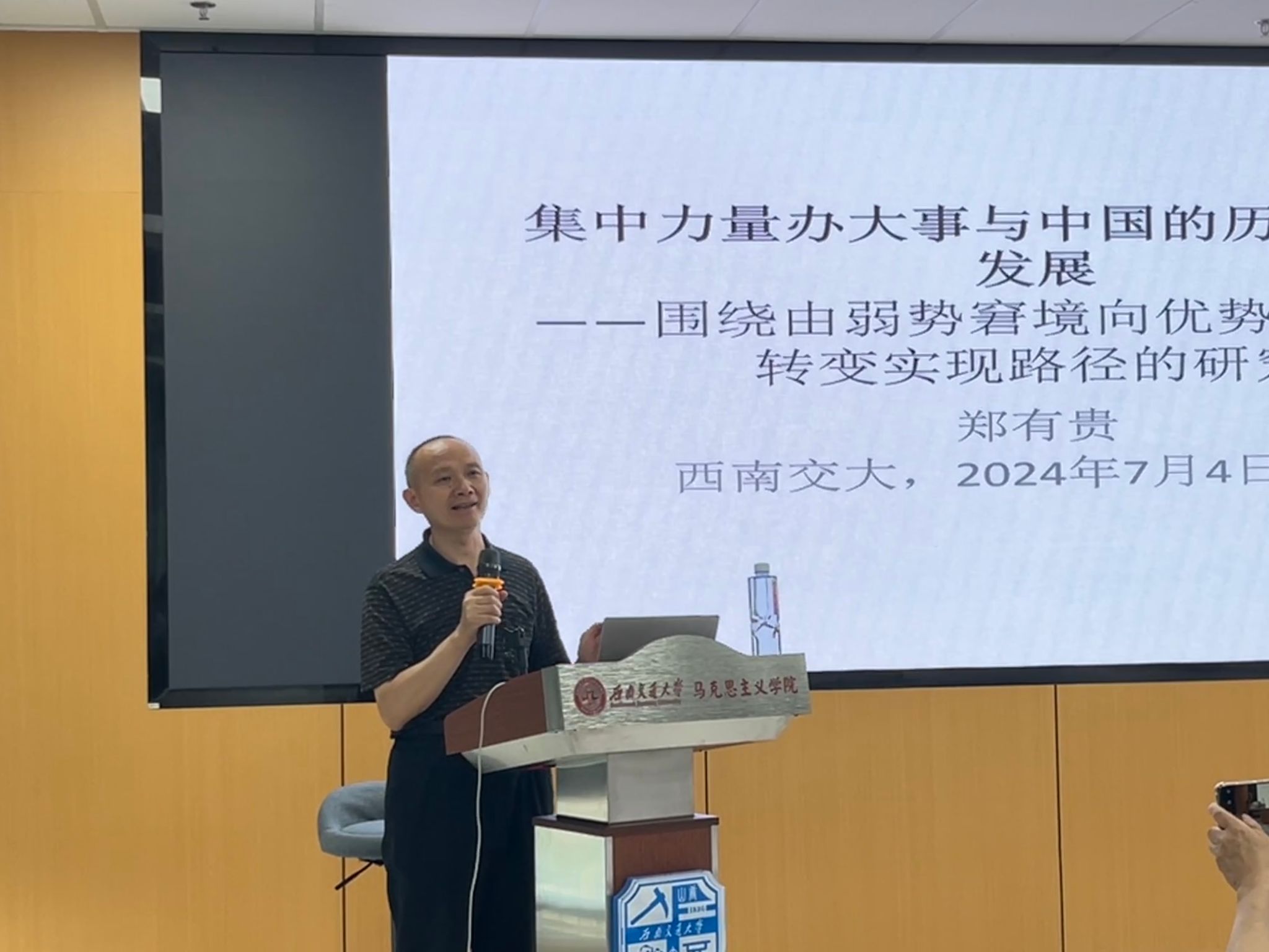 郑有贵教授以《集中力量办大事与中国的历史性跨越发展》为题,站在社会转型和主体力量的视角,阐释了中国特色社会主义制度的优越性以及中国历史发展的历史性跨越。郑教授指出,中国式现代化的发展实现了由弱势窘境向优势跨越发展的转变,成功破解了现代化进程中的两大难题。一是作为后发工业国家,中国实现了跟跑、并跑再到部分领跑的跨越发展;二是破解了工业化、城镇化进程中世界普遍拥有的城乡二元结构问题。作为后发国家,我们的后发优势对于解释我国的跨越性发展具有重要意义。