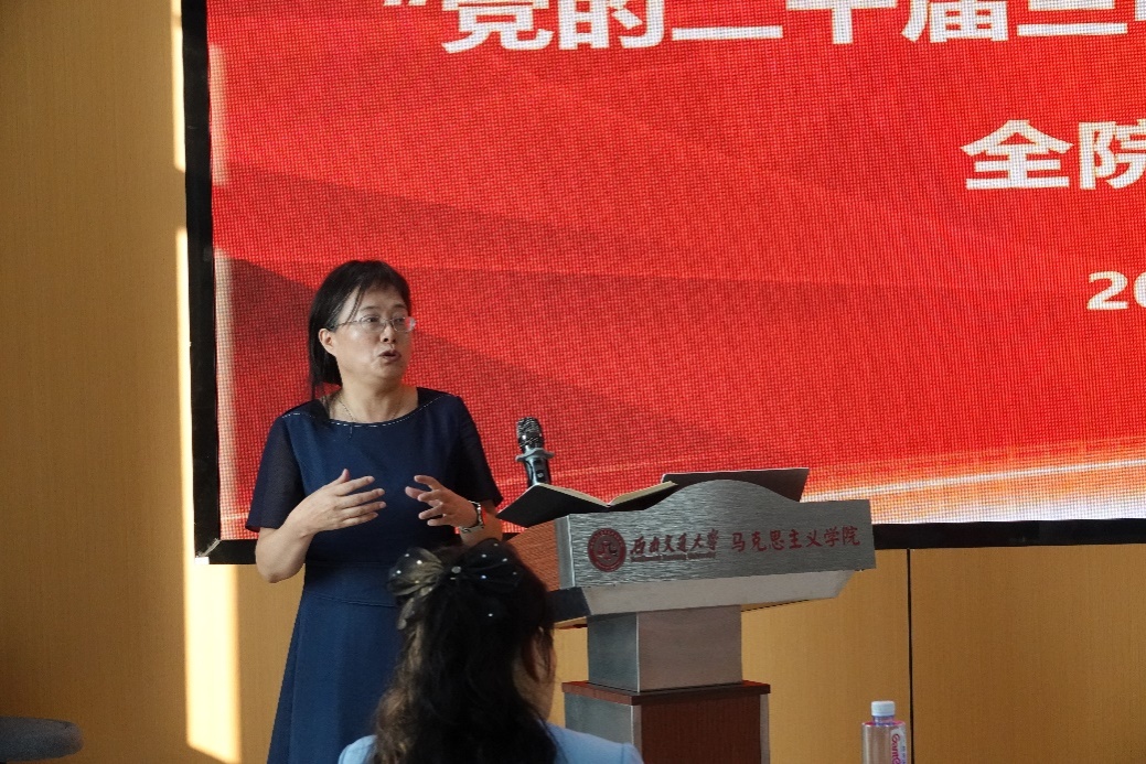在思政课建设方面所作的努力和贡献。她指出:“马院的老师们很有修养,既能在思想上保持高度统一,又能在教学中发扬各自的特色,讲授出了思政课的‘艺术’”。思政课作为马院培育时代新人的主阵地、主战场、主渠道,具有极其重要的意义。广大教师应明确自己的身份和角色,牢记自己的初心和使命,以饱满的精神生动形象地讲好思政课,用深入浅出的讲授法把党的二十届三中全会精神融入思政课堂、融入学生头脑,讲出师德师风,讲出党性修养,讲出中国自信。杨爱华副书记的发言旁征博引、高屋建瓴,赢得全场经久不息的掌声。
