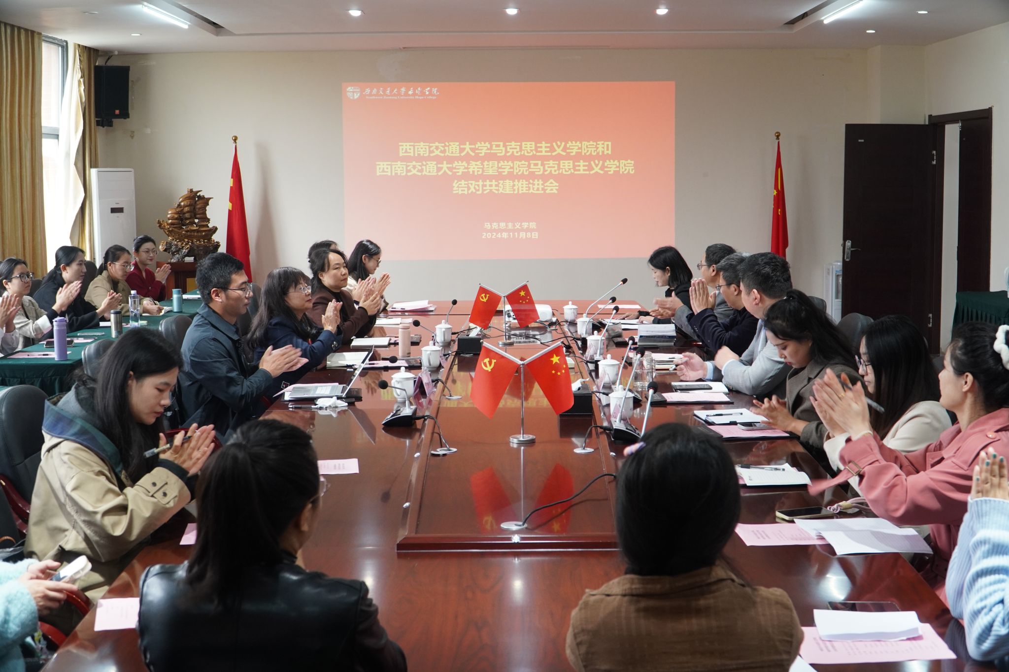 许义文院长进行了总结发言,他表示,公办民办马院结对共建是民办高校马院快速成长和发展的战略性举措, 此次共建推进会为两院合作共建搭起高水准沟通交流平台,促进了教师之间的经验共享和思想碰撞。双方单位将进一步深化合作、细化交流,以提升思政课教学质量这一重点目标为引领,努力把共建互促的新优势持续转化为携手同行的新动能,力争在新时代的长征路上不断取得新成效、新进展和新胜利。