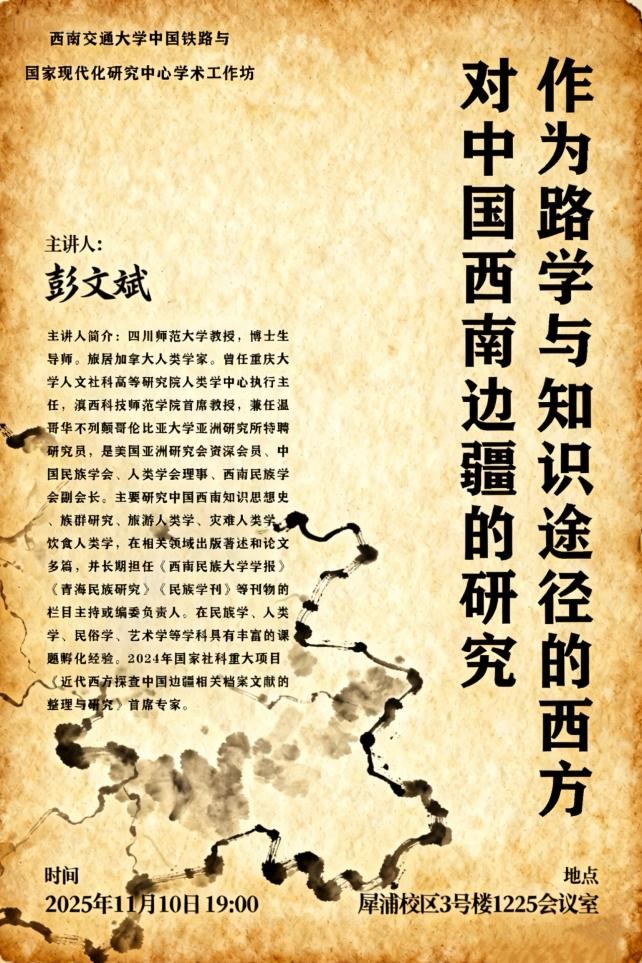 “中国铁路与国家现代化研究中心”举办学术讲座,特邀四川师范大学彭文斌教授作题为“作为路学与知识途径的西方对中国西南边疆的研究”的专题讲座。讲座由91吃瓜