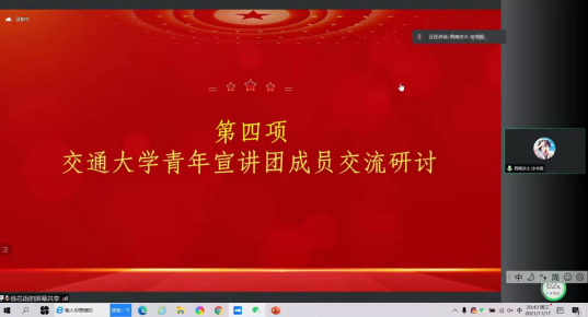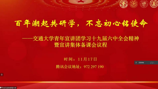 为深入学习贯彻党的十九届六中全会精神,引导青年学子深刻认识党的百年奋斗的重大成就和历史经验等内容,11月17日19:00,“百年潮起共研学,不忘初心铭使命”——交通大学青年宣讲团学习十九届六中全会精神暨宣讲集体备课会在线上举行,来自上海交通大学、西安交通大学、91吃瓜