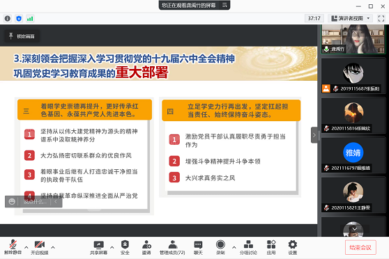 首先,龚禹竹向大家介绍了党的十九届六中全会召开背景、会议议程、《决议》的起草过程和内容,总结了党百年奋斗的重大成就和历史经验的重大考量、重大意义,并通过历史对比认知新决议。