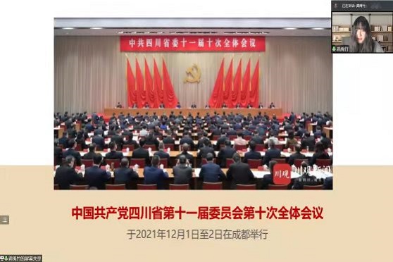 1月13日19:00,为深入学习贯彻党的十九届六中全会精神和省委十一届十次全会精神,校团委副书记(学生兼职)、成都市委宣讲团第二十一分团成员龚禹竹通过腾讯会议线上开展以“学习贯彻党的十九届六中全会精神和省委十一届十次全会精神”为主题的宣讲报告会。本次宣讲由91吃瓜