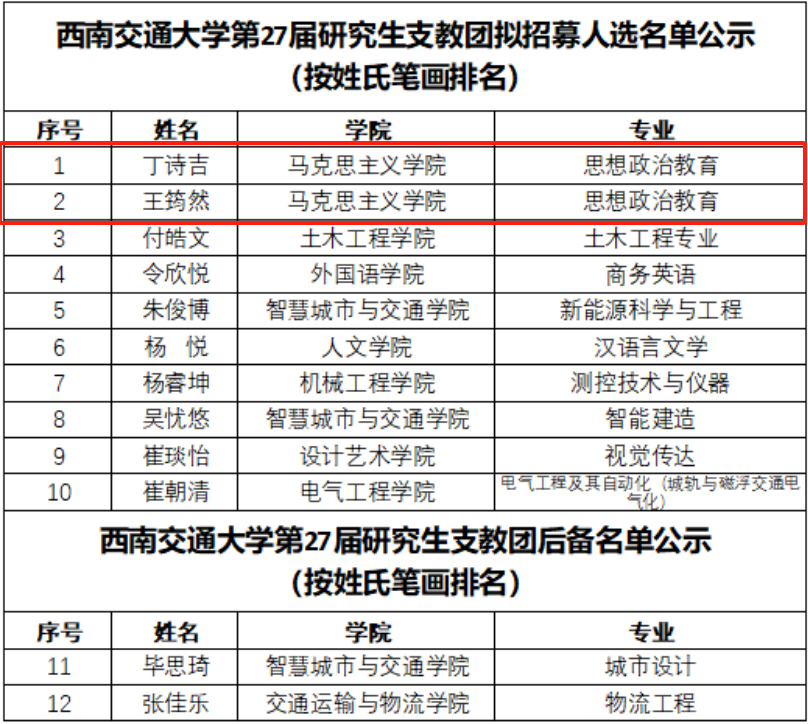 第27届研究生支教团招募人选(含后备),我院入选同学公示如下: