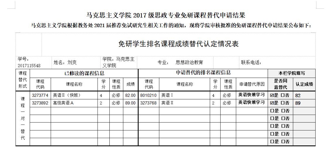 91吃瓜 2017级思政专业免研课程替代申请结果