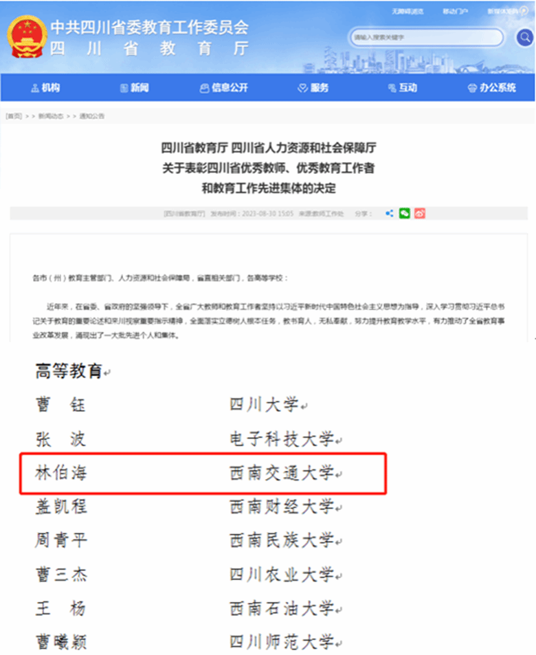 Recently, the website of the Department of Education of Sichuan Province released a list of outstanding teachers, outstanding education practitioners, and advanced collectives in education in Sichuan Province. Professor Lin Bohai from our School was awarded the honourable title of “Outstanding Teacher in Sichuan Province”.
