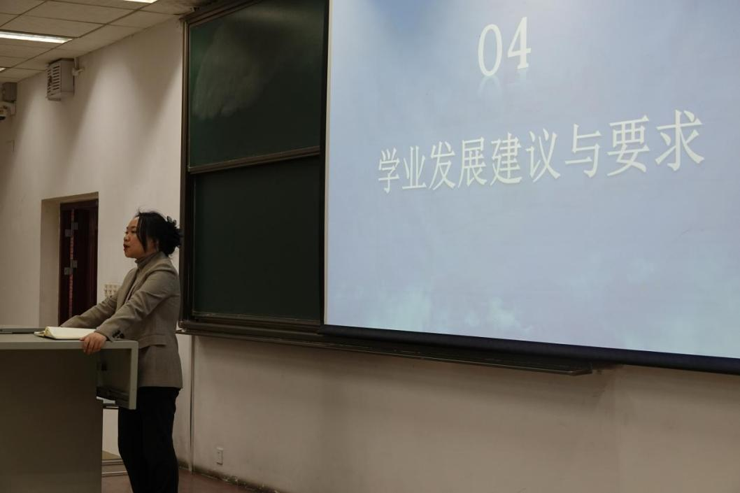 接下来,王菁围绕学业发展与规划提出建议。她介绍了学科基本情况与学科竞赛信息,整体梳理了大学四年的规划路径,强调要扎实积累专业知识、积极参与竞赛、勇于尝试学术写作。她鼓励同学们勇于突破自我,主动与老师沟通交流,拓宽视野,明确方向。