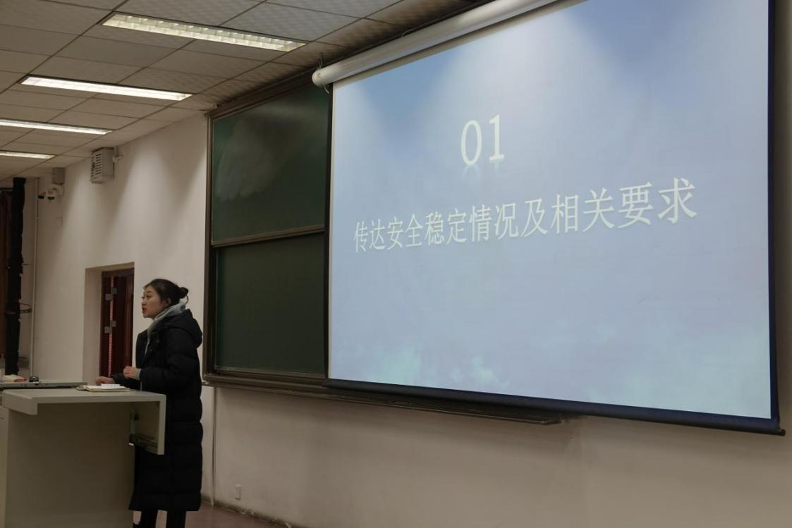 首先,敬宇提醒近期安全稳定相关工作。她从人身与财产安全、元旦假期出行安全、防范电信诈骗、冬季防火及校园施工安全等方面逐一讲解,并再次强调规范离校请假流程,叮嘱同学们时刻筑牢安全防线,保持警惕。