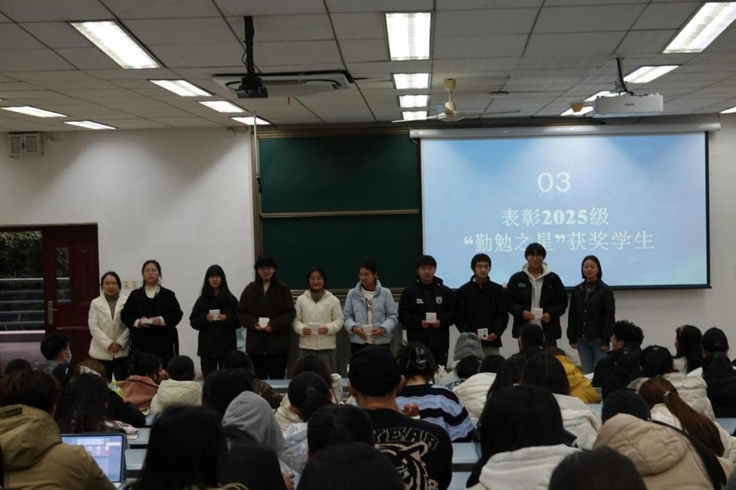 随后,邓秀芸、王菁表彰2025级“勤勉之星”获奖学生。该荣誉旨在表彰在新生晚自习中出勤率位列前八的同学,他们分别是詹宝婷、曹程仁、罗媛媛、许祖豪、郑豪杰、殷月、郭雅欣、李骄然。此次表彰鼓励全体同学以他们为榜样,养成勤奋刻苦、持之以恒的学习态度。
